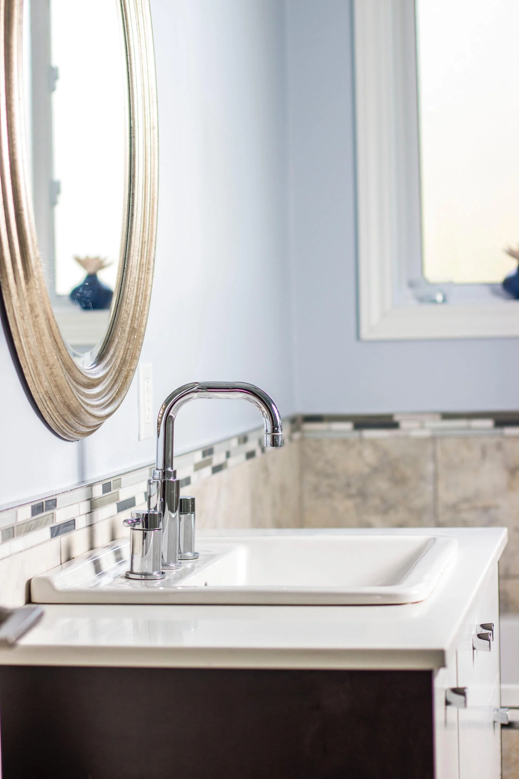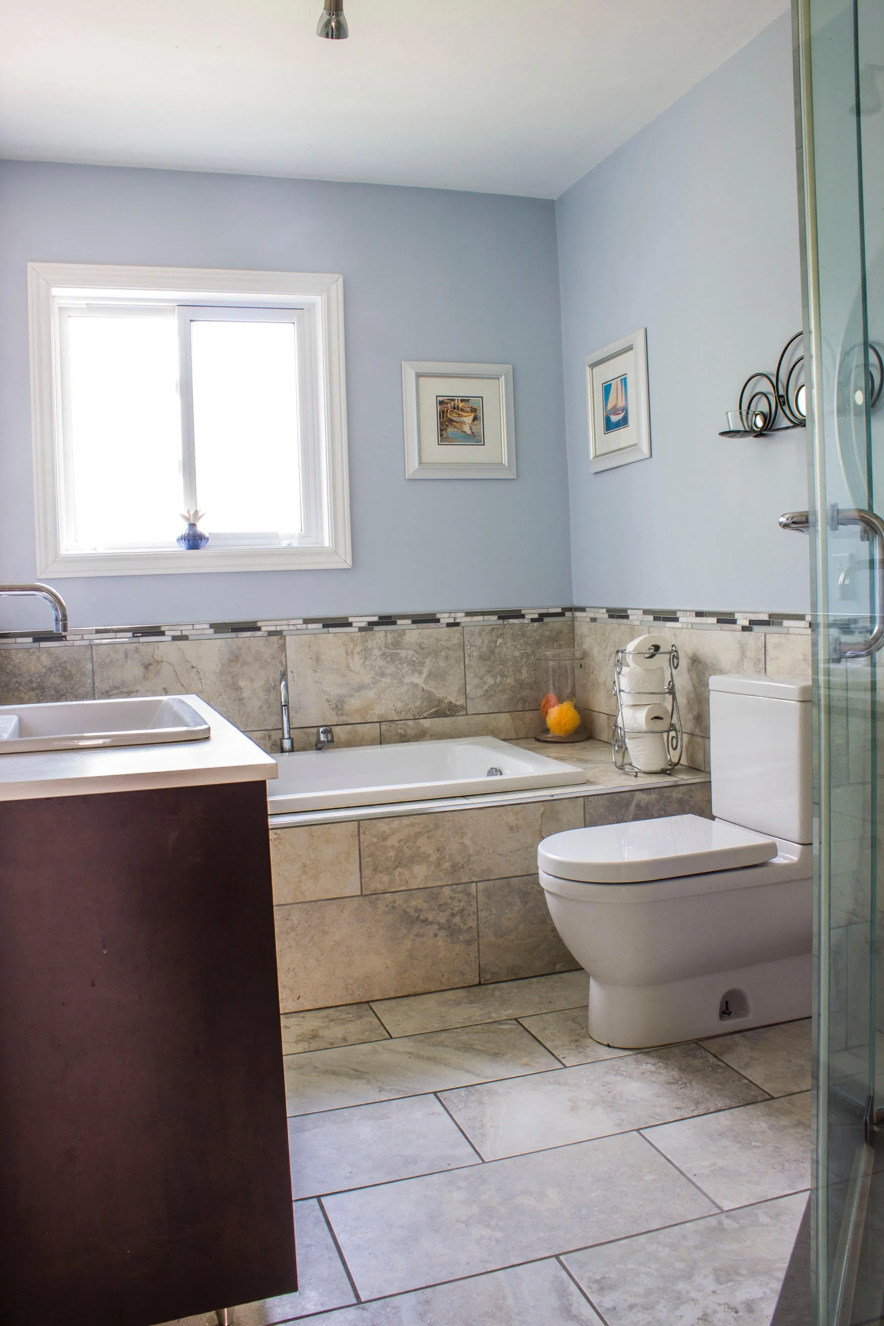 Bain & cuisine Montréal/ Conseils et choix des matériaux 2013 Classique MarinLe choix des carreaux marque parfaitement le style classique recherché, qui s'harmonise avec le bleu ciel qui rappelle également celui de la mer.