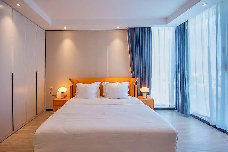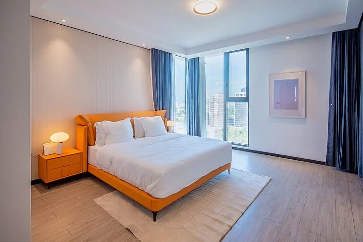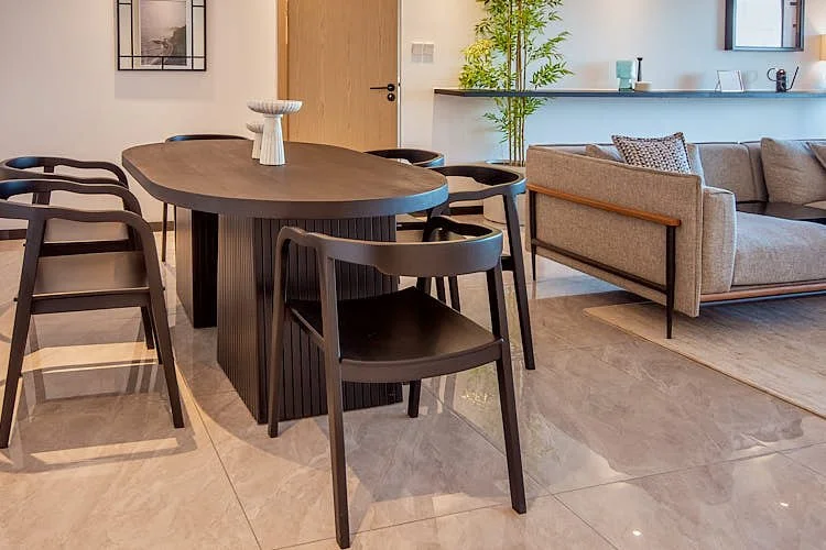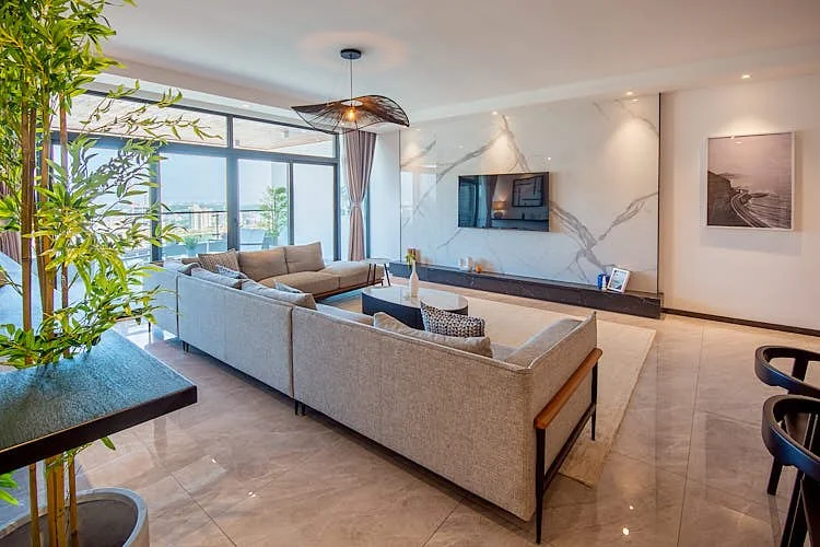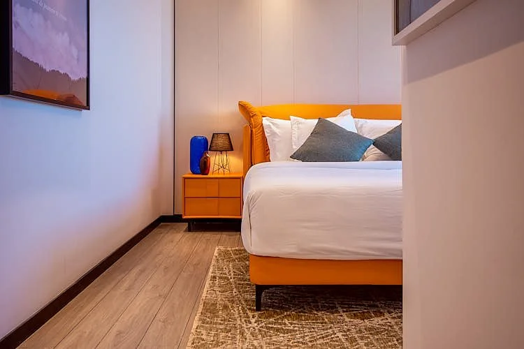 Les chaises, la table à manger et la tablette de deux fois 3m de longueur sont fabriquées sur mesure et localement. Les couleurs sobres du salon ainsi que le sofa en L permet un lieu spacieux. Les lits en cuir camel orangé donnent une touche new yorkaise avec les petites touches de couleurs et un mix de texture de bois, de marbre, et de verre soufflé.
